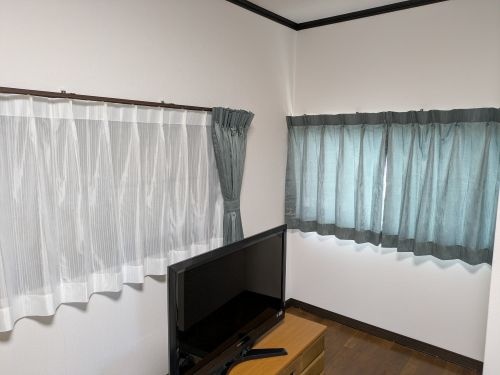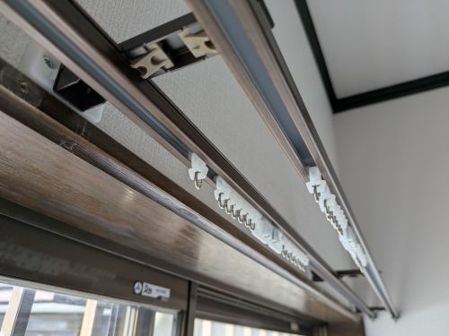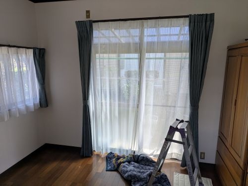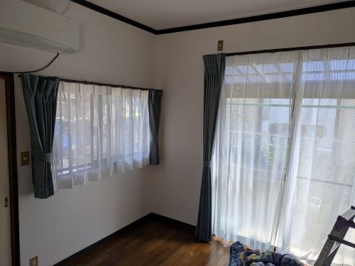レールの取り付けが終わりましたので、ドレープカーテン、レースカーテンを各窓に取り付けました。