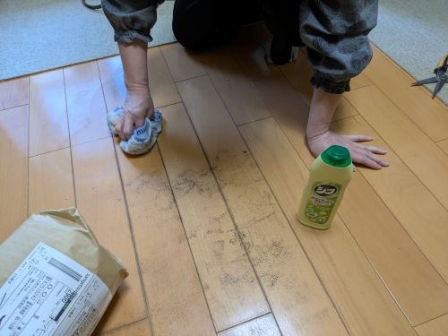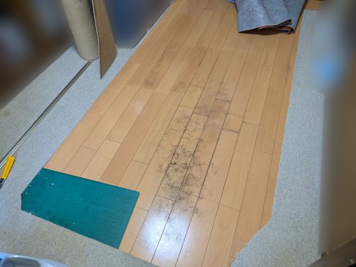 掃除機をかけ終わり、新しく敷くカーペットのサイズの寸法に合わせて既存のカーペットをカッターとハサミとで切っていきました。すると、フローリングもカビていました。