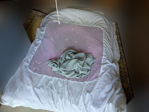 奥様が子供さんのふとんを干そうと敷きふとんを剥ぐったところ・・・。